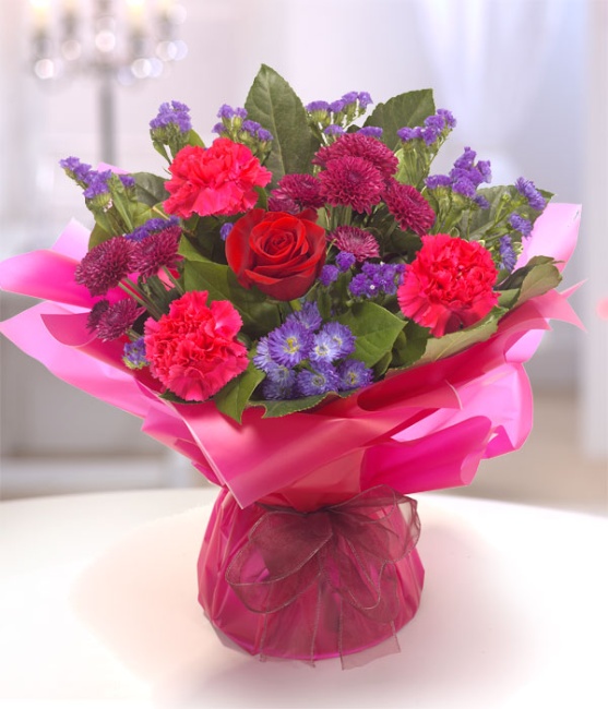Aqua pack hand-tied bouquet delivered in water for freshness. Passionate, rich colours of red, purple and cerise. Containing a red Rose, Carnations, Chrysanthemum