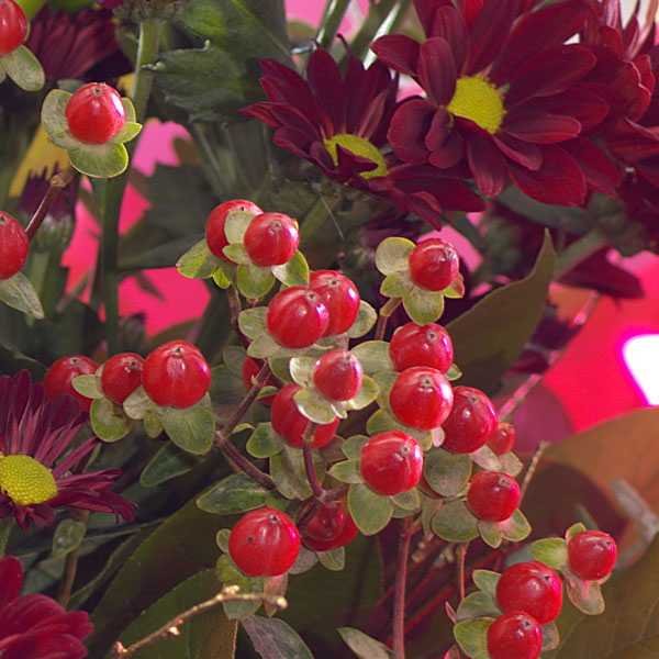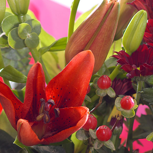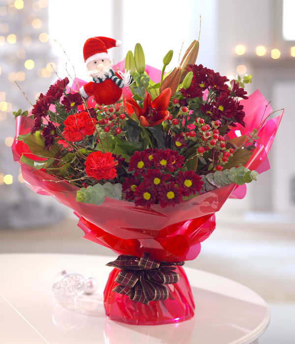 A bright bouquet of rich reds and Santa! Chrysanthemum, Carnation, Lily and Hypericum make this a lovely Christmas flower combination.