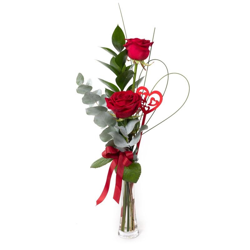 A duo of sumptuous red roses delightfully partnered with the finest foliage in a glass vase.