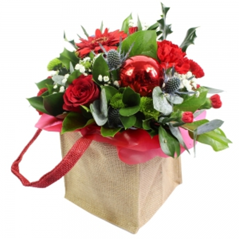 This beautiful baubled gift will include a festive range of florist fresh flowers. Including Santini, Holly, Eucalyptus Cinnerea and Ruskus.